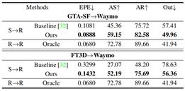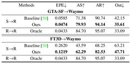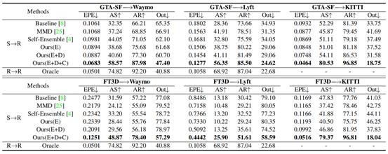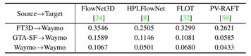 实验:(1) 本文首先测试了多种目前广泛使用的点云场景流估计模型,通过对比它们从不同源域直接迁移到目标域的性能,验证了:1)现有合成数据与真实数据间存在较大域间隙,导致模型出现性能退化;2)本文提出的GTA-SF数据集能够有效降低域间隙造成的模型性能退化。