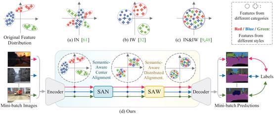 背景:现阶段针对语义分割的域泛化特征对齐算法大多是采用特征归一化、特征白化、或者两者结合的方式,以期实现模型的自适应域不变特征提取。特征归一化方法通常利用实例归一化(IN)来消除特征风格差异,IN通过将多种风格的特征将聚拢在特征空间的中心区域,以消除不同风格特征之间的差异,然而,如图1 (a)所示,该方法仅能实现特征的中心对齐,没有考虑到特征的联合分布,很多不同风格的局部特征仍然存在较大的空间距离;特征白化方法通常采用实例白化(IW)来统一不同风格特征的空间分布,然而,如图1 (b)所示,尽管IW可以使得不同的风格特征具有相同的分布形状,但是不同风格的特征之间仍然存在明显的距离,导致跨域分割效果不理想;两者结合类方法主张利用IN与IW分别实现特征的空间中心化与分布标准化,以此在空间位置和联合分布的层面同时约束特征,然而,该方法没有进一步考虑到特征的语义类别属性,如图1 (c)所示,在特征中心对齐与分布对齐后,不同类别的特征可能会错误地聚拢到一起,类别属性的错配会导致模型在具体分割时难以鉴别种类,从而生成边界模糊甚至错误的分割结果。