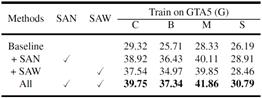 总结:在本文中,我们提出了两个模块来解决语义分割的领域泛化问题:语义感知归一化(SAN)和语义感知白化(SAW),它们依次执行语义特征的中心对齐和分布式对齐,以实现域不变特征的有效提取,详细的实验证明了SAN以及SAW的有效性。