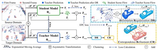 模型整体输入包含源域(合成数据)和目标域(真实数据),均为连续帧点云的形式。源域数据输入学生模型,并利用场景流标签计算L1损失。目标域数据输入教师模型,并同时经非对称变换对第一帧点云产生扰动后输入学生模型,通过约束学生模型的最终预测结果与教师模型一致,从而提高学生模型在目标域上对扰动的鲁棒性。