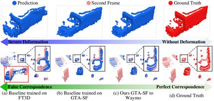 背景:场景流估计(Scene Flow Estimation)旨在从连续帧中预测三维运动场(3D Motion Field)。作为光流的一般化形式,场景流表示物体的三维运动并可用于预测物体将来运动,其在机器人导航和自动驾驶等领域有着重要应用价值。随着三维传感以及数据驱动技术的发展,基于深度学习的点云场景流估计方法引起了国内外学者的广泛关注。由于训练模型所需的逐点场景流标签的人工标注成本高,近年来,研究者们常常利用合成数据与直接生成的标签进行训练,从而避免人工标注过程。尽管这种利用合成数据训练并在真实数据上测试(即合成-到-真实)的方法取得了良好的效果,但其在实际应用中仍面临着以下几方面挑战。首先,现有用于场景流估计的合成数据集较为稀缺且与真实场景差异较大,目前还缺乏能够充分捕捉真实世界动态的合成数据,这增加了模型从合成到真实的迁移难度。其次,合成与真实数据间不可避免存在域间隙(Domain gap),这将造成直接迁移的模型出现性能退化。然而目前对于点云场景流估计任务,如何克服这种合成到真实域间隙以提升模型鲁棒性,仍是一个未被有效解决的问题。