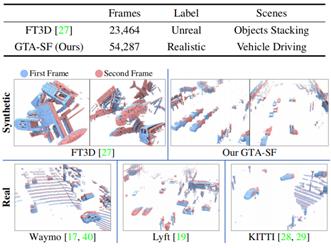 对于下一帧中没有对应实体的点,本文以类似的方法计算其自我运动场景流,即所驾驶车辆运动所导致的周边物体相对移动。此外,由于属于地面的点对于场景流估计无实际意义,因而通常会被去除,本文通过游戏读取的实体信息对地面点进行去除。本文提出的GTA-SF是一个用于真实场景流估计的大规模合成数据集,它包含了54287对带有密集标注场景流的连续点云,更多分析与展示详见原文。