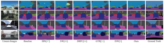 图3 不同域泛化方法的可视化语义分割结果对比