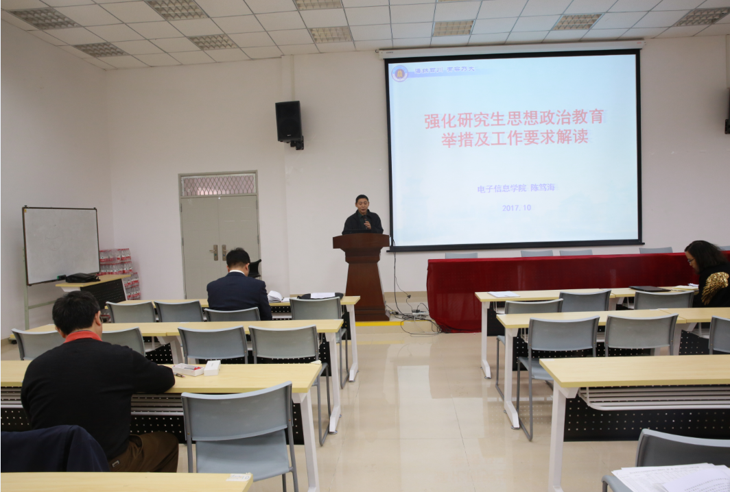 然后,学院党委陈笃海副书记以“强化研究生思想政治教育举措及工作要求解读”为主题,详细介绍了学院研究生导师队伍、研究生辅导员队伍的建设目标和举措,同时还介绍了关于加强落实“研究生综合素质课程”改革这一方面的学校建议和学院安排。