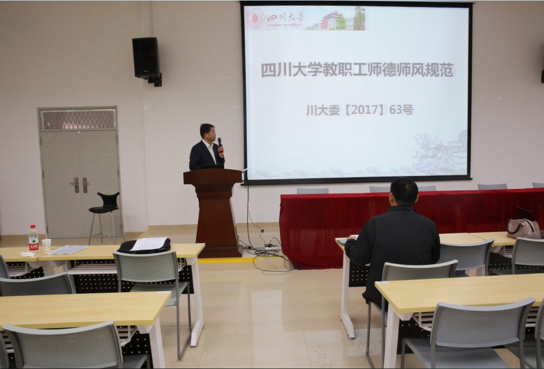 教职工师德师风规范”展开了介绍。其中,他主要强调了意识形态工作的重要性,并就如何提高做好意识形态工作的能力提出了建议。他还强调了如何正确处理师生关系来更好地进行培养工作。