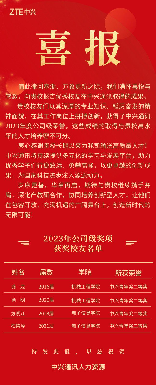 近日,学校收到中兴通讯发来的喜报,对获得中兴通讯2023年度公司级荣誉的优秀校友进行通报,并感谢学校为公司输送的高质量人才。其中,a漫 2018届硕士毕业生方明江、2021届硕士毕业生柏梁泽都荣获中兴青年奖二等奖。