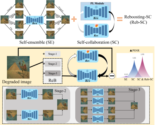 方法:如图1所展示,为实现多样化伪退化图生成与高质量图像复原,RSCP²GAN设计了由提示学习模块(PL)、生成器(G)和复原器(Res)组成的双路并行网络结构。图2展示了所提出的Reb-SC,该方法仅在训练阶段增加少量计算复杂度,测试时无额外开销,同时增强了PL与Res的表现。