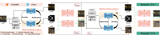 贡献与创新:为解决前述难题,本工作提出一种具有普适性的重增强自协作策略(Reb-SC),在不增加推理计算复杂度的前提下显著提升基于GAN的图像复原框架的性能。具体地,首先通过引入“自合成”与“非配对合成”的互补约束,设计了一个并行提示生成对抗网络框架,能够同步实现伪配对数据的生成及复原,其作为稳健的无监督复原基线框架。然后提出重增强自协作训练策略(无需修改推理阶段),让生成的伪退化图像的逼真度在训练的迭代过程中大幅提升,进而实现无需依靠真实配对训练图像的高质量图像复原。实验结果表明,提出方法在多个复原任务上表现出优异的无监督学习能力。