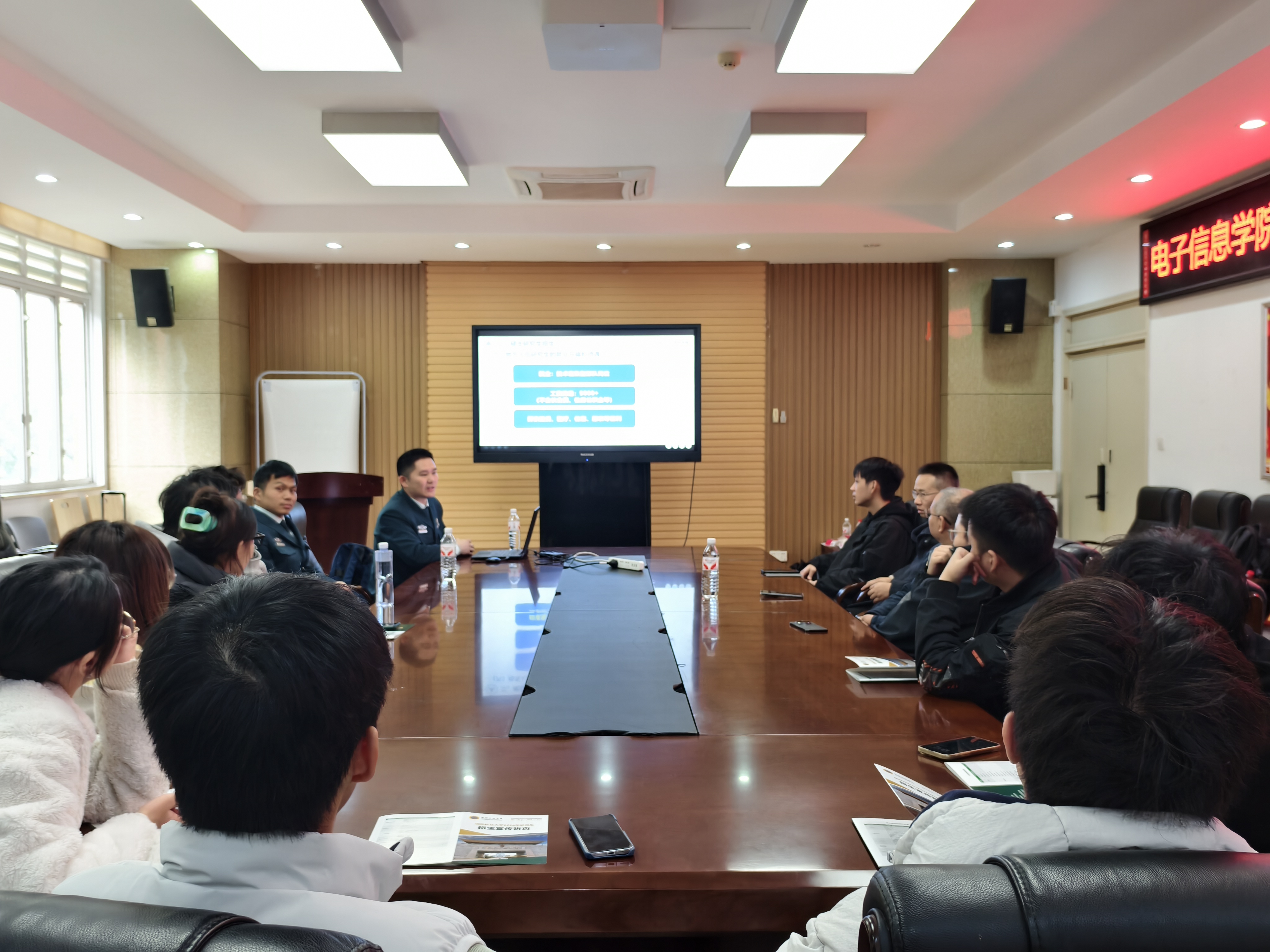 授牌仪式后,招生宣讲会正式拉开帷幕。国 防科大前沿交叉学科学院的张老师通过详实的数据与丰富的案例,系统介绍了学院的辉煌历史、顶尖的科研平台与特色鲜明的人才培养体系。学院历史可追溯至1958年,在光学工程、电子科学与技术等学科领域底蕴深厚。当前,学院聚焦于高能激光、高功率微波、激光陀螺及量子信息等前沿科研方向,并以“智能+”和交叉融合为特色,致力于推动国 防科技的自主创新。