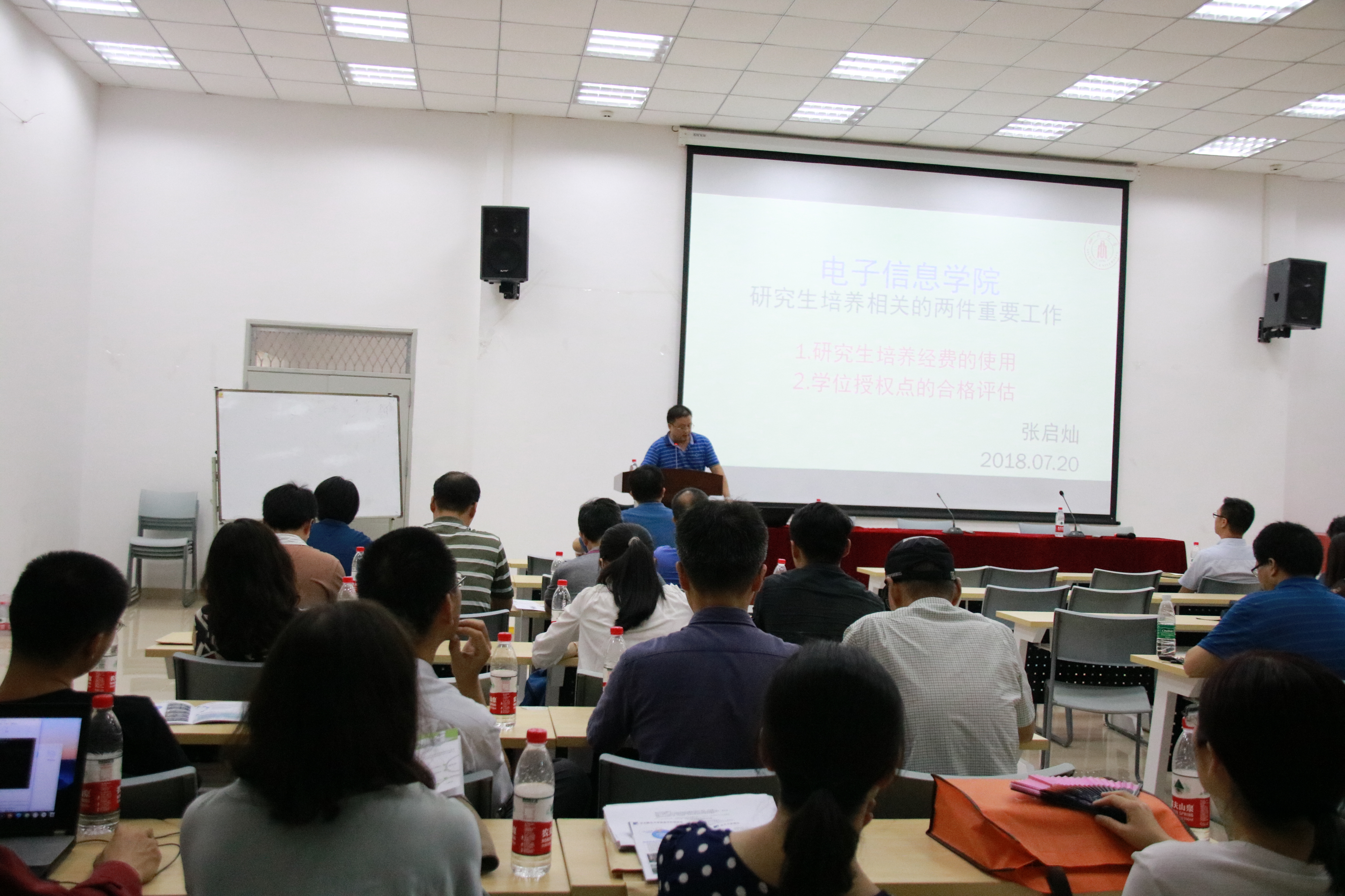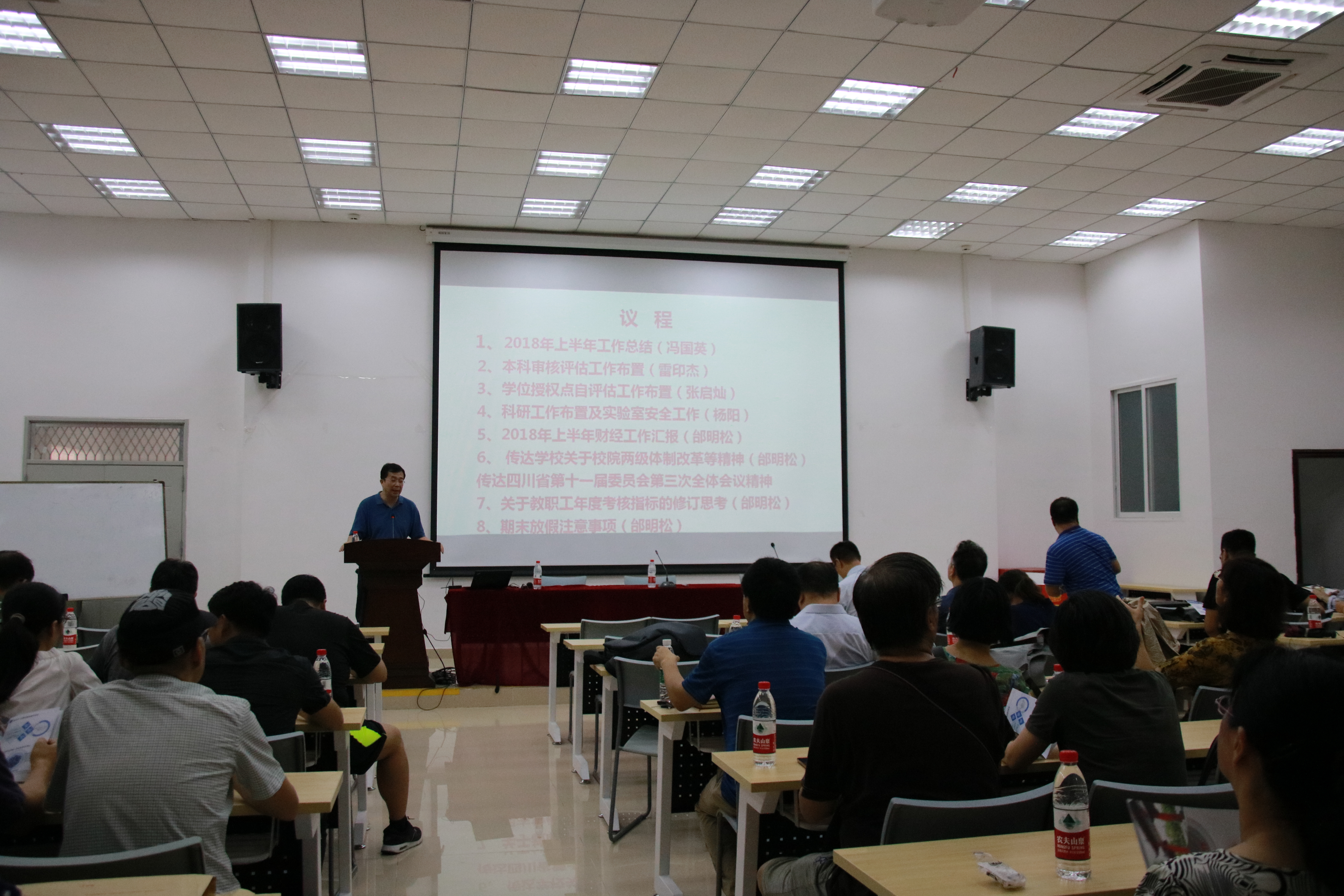 邰明松书记向全体教职工做了2018年上半年学院工作总结报告、2018年上半年学院财经工作报告、学院教职工年度考核指标的修订思考;传达了学校关于校院两级体制改革等精神、四川省第十一届委员会第三次全体会议精神等内容,并要求全体教职工做好假期期间个人、学生和实验室的安全工作。