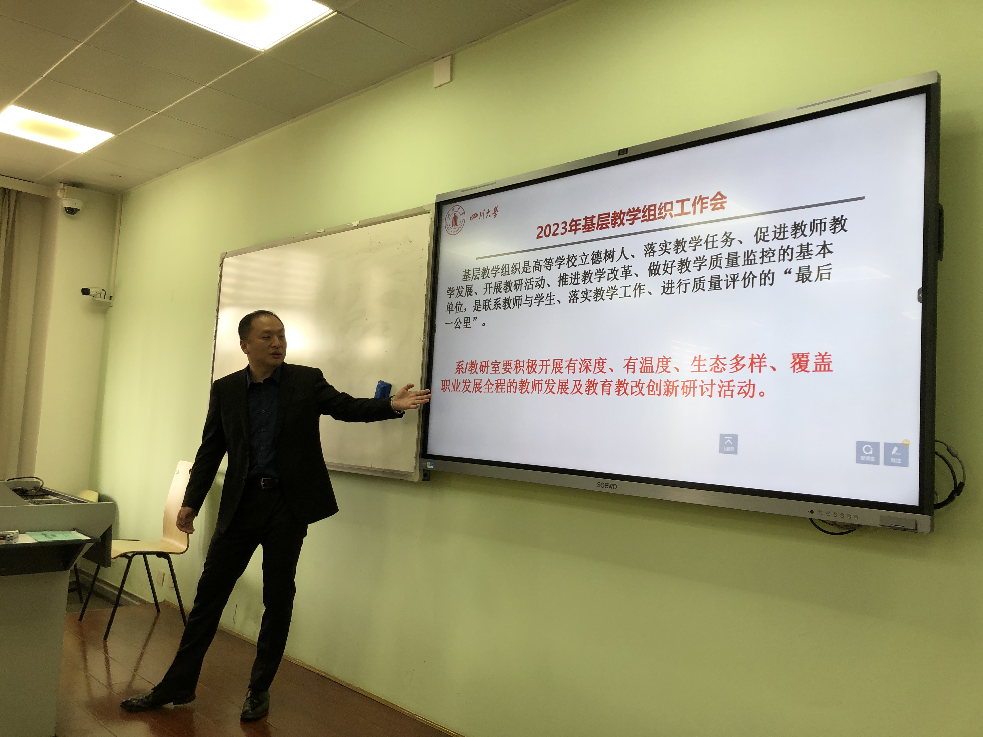 雷印杰副院长在会上说,为切实发挥基层教学组织在提高教育教学质量中的重要作用,学院要进一步完善基层教学组织的建设与管理,加强基层教学组织建设,建设优秀示范基层教学组织,激发基层教学组织活力。教研室要定期开展教学研讨交流活动,不断更新教师教育教学理念和方法,组织青年教师听课观摩,加强教学梯队建设,积极发挥学科专业优势,将最新的学科前沿成果融入课堂教学,打造一流课程,要组织选用或编写高水平优质教材,加强教学研究项目、教研论文发表和教学成果奖励申报,努力发挥基层教学组织在立德树人、提高教学质量和人才培养中的核心作用。