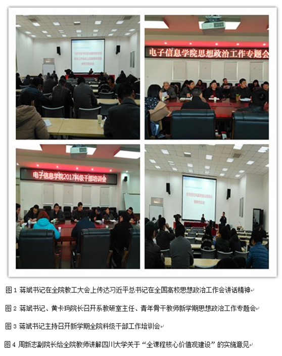 3、积极学习国家和学校重要教育方针政策,加强教师思想政治素养,立德树人。2月27日-3月3日,学院先后组织召开了领导班子、科级干部、系教研室主任、全院教工大会学习传达了会议上的重要讲习近平总书记在全国高校思想政治工作会讲话精神、教育部党风廉政建设视频会精神、a漫