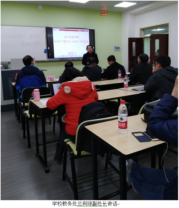 小班化-探究式教学竞赛”获奖者邓国亮老师共同担任教学竞赛的评委。学校教务处兰利琼副处长到会讲话和指导,现代教育中心甘启宏老师赛前指导,学院60多位老师到场学习观摩。