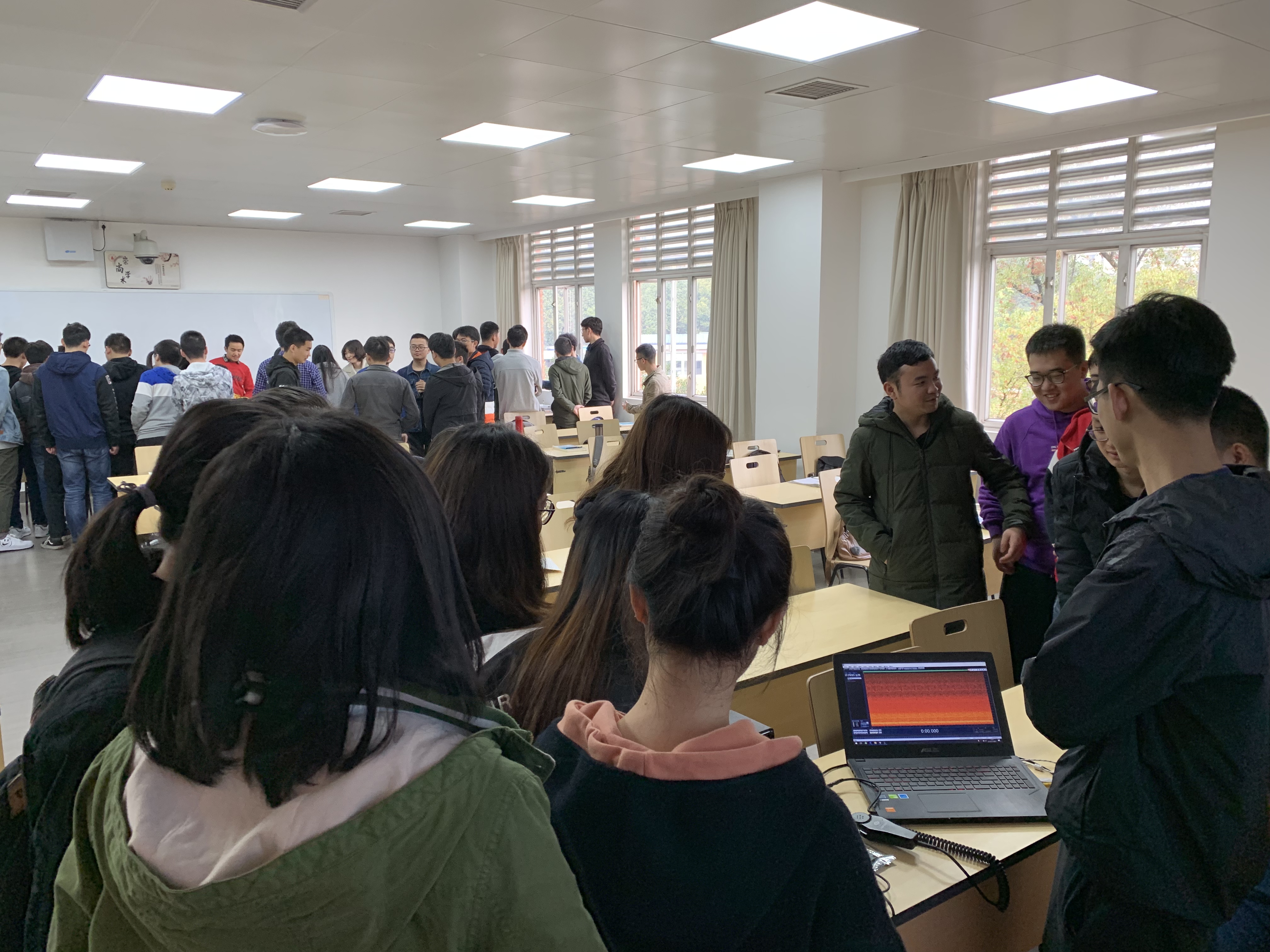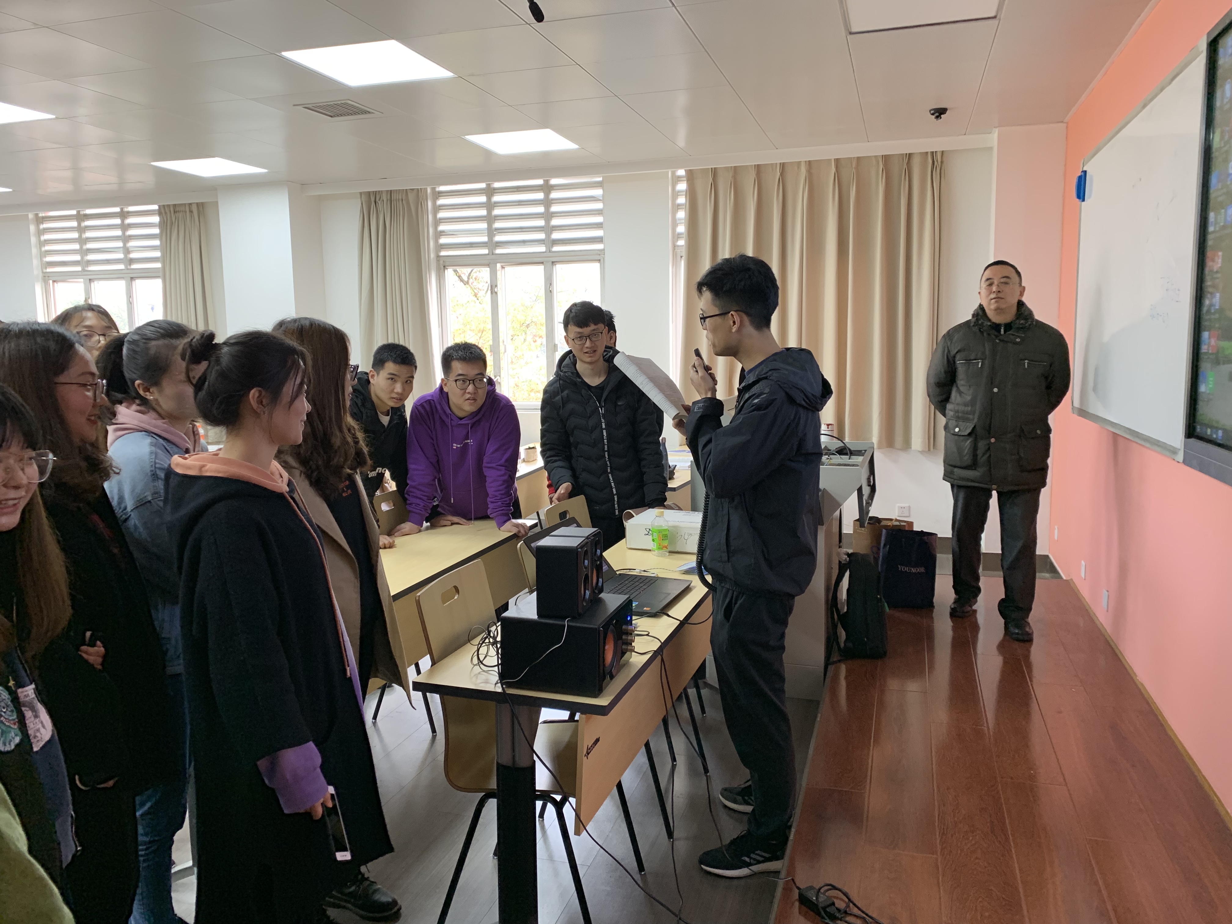 2019年3月18日上午,在望江基教A401教室,《移动通信技术》的课堂上学生们正在自由观看着讨论着。学院教学副院长雷印杰来到课堂现场听课,看到这么活泼生动的课堂眼前一亮,果然如学生们反映,高勇教授把实验室的科研设备和科研成果带进了本科课程《移动通信技术》的课堂,很受学生们欢迎。