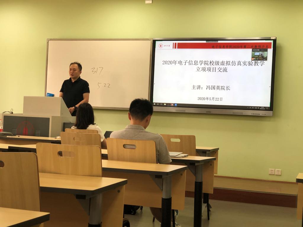 会上,冯国英院长以“先进光波导-微芯片虚拟仿真实验”为主题,对如何深入有效地开展虚拟仿真实验教学项目建设与申请工作作出了模范式引导;并从本项目的立项目标与波动光学这门课程之间的关系进行了深入的剖析;同时,指出本项目的中远期目标是建立面向我校电子、材料、物理以及生物医学等多学科方向学生共同实验学习、自主探究和多学科交叉的开放共享平台。