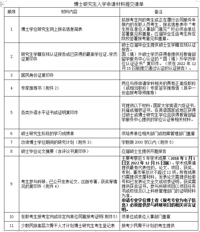 符合报考条件的人员须下载 “提交博士研究生入学申请材料自查表”(附件1),按顺序整理材料,并在2022年12月15日17点前将申请材料、自查表和相关附件材料寄送达a漫