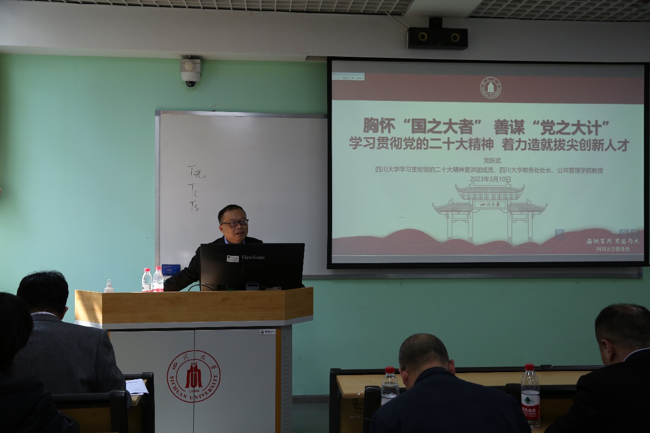 在望江校区东三教学楼117室举行了学习贯彻党的二十大精神专题报告会,本次专题报告会特邀学校“学习贯彻党的二十大精神宣传团”专家、教务处处长党跃武教授主讲,报告会由学院党委书记邰明松同志主持,学院全体教职工及部分学生党员参加了专题报告会。