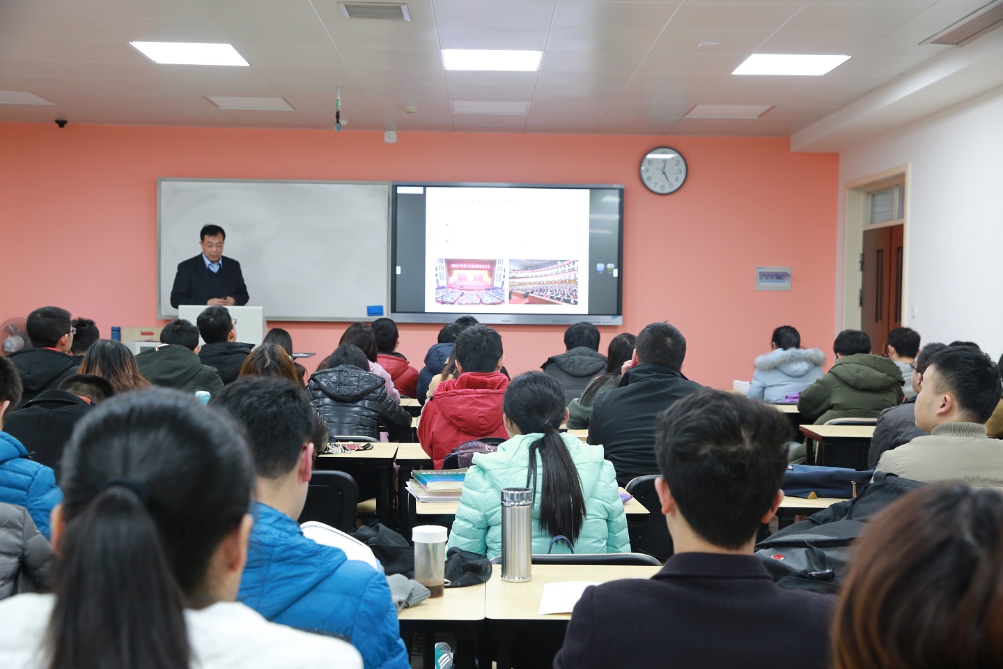 下午5点,讲座正式开始。首先,邰明松书记向大家讲解了十九大的重要地位和主要亮点,指出从十八大以来,通过“精准扶贫”、“简政放权”、“科技创新”等决策解决了许多长期想解决而没有解决的难题。并强调我国的主要矛盾已由人民日益增长的物质文化需要同落后的社会生产力之间的矛盾转变为人民日益增长的美好生活需要和不平衡不充分的发展之间的矛盾。然后,邰书记指出中国的高等教育事业发展进入新时代,从过去的重视“规模和数量”转变为现在的重视“质量和效益”,a漫