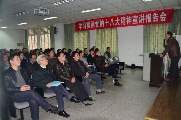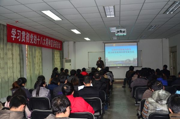 深入学习贯彻党的十八大精神宣讲报告会在基础教学楼A303会议室举行。此次报告会主讲人是来自学校十八大精神宣讲团成员、经济学院博士生导师蒋和胜教授,报告主题为“以科学发展观为指导,着力转变我国经济发展方式”。报告会由党委书记蒋斌主持。a漫