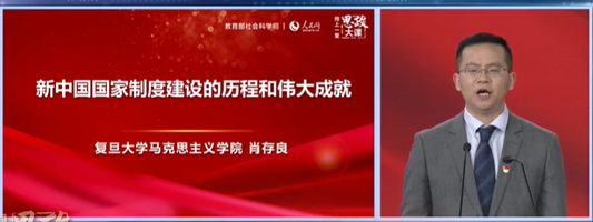 此次线上活动主要由天津师范大学马克思主义学院副教授、中国近现代史纲要教研室副主任王雪超老师,上海师范大学马克思主义学院院长、教授张志丹老师,复旦大学马克思主义学院副教授、中国近现代史纲要研究室主任肖存良老师为我们授课。王雪超老师从民族独立新形象——由丧权辱国到屹立东方、国家统一新局面——由四分五裂到团结统一、人民解放新面貌——由受人压迫到成为主人三个方面为我们进行讲解,最后以没有共产党,就没有新中国作为结语,王雪超老师表示,希望同学们不负青春,不负韶华,不负时代,铭记新中国历史,走好人生道路,为实现中华民族伟大复兴贡献聪明才智。张志丹老师给我们讲的主题是新中国经济发展的奇迹,主要从新中国经济发展的奇迹“奇”在何处及新中国经济发展“密码”为何进行讲解,张志丹老师最后表示,在两个大局交叠互动的背景下,我们面临着各种机遇和挑战,但是我们有理由相信,只要始终坚持党的领导,牢牢把握中国经济奇迹发展的密码,继续发挥我们的制度优势,改革不停顿,开放不止步,发展不休止,方向不偏离,就一定能实现社会主义现代化和中华民族伟大复兴。肖存良老师讲的主题是新中国国家制度建设的历程和伟大成就,主要从社会主义革命和建设时期国家制度建设的历程与成就、改革开放新时期国家制度建设的历程与成就、中国特色社会主义新时代国家制度建设的历程与成就三方面进行讲解,最后肖存良老师表示,历史给我们的启示是国家制度建设始终要坚持党的领导,国家制度建设要始终坚持马克思主义基本原理与中国实际相结合,制度优势需要转化为治理效果。