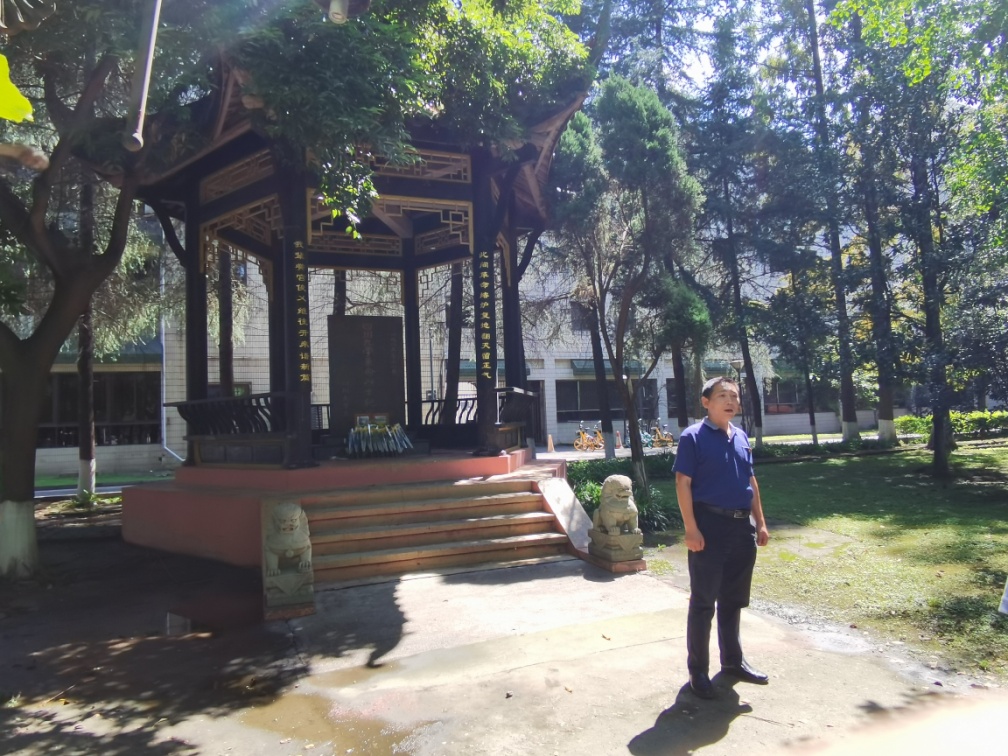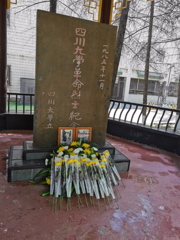 革命先烈纪念碑是为建立新中国而英勇牺牲的川大师生而于1985年修建的,碑亭立柱上有一副对联,上联是“此间革命熔炉复地翻天留正气”,下联是“我辈黉宫俊人继往开来谱新篇”,纪念碑背面刻有张培爵、王右木、恽代英、童庸生、杨闇公、袁诗尧、李正恩、江竹筠(江姐)等四十多位曾经在川大学习和工作过的革命烈士的名字。
