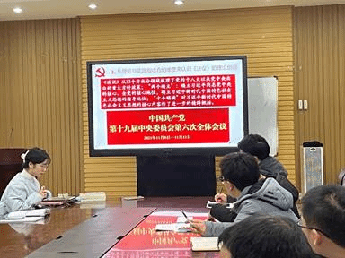 党支部书记孟亚婷和宣传委员金雨霜分别从:历史与现实相统一、理论与实践相结合、经验与精神相交融、国内与国际相贯通四个维度带领全体党员深刻认识了十九届六中全会《决议》。全体党员通过学习更加进一步坚定了跟党走中国特色社会主义道路的信心和决心。