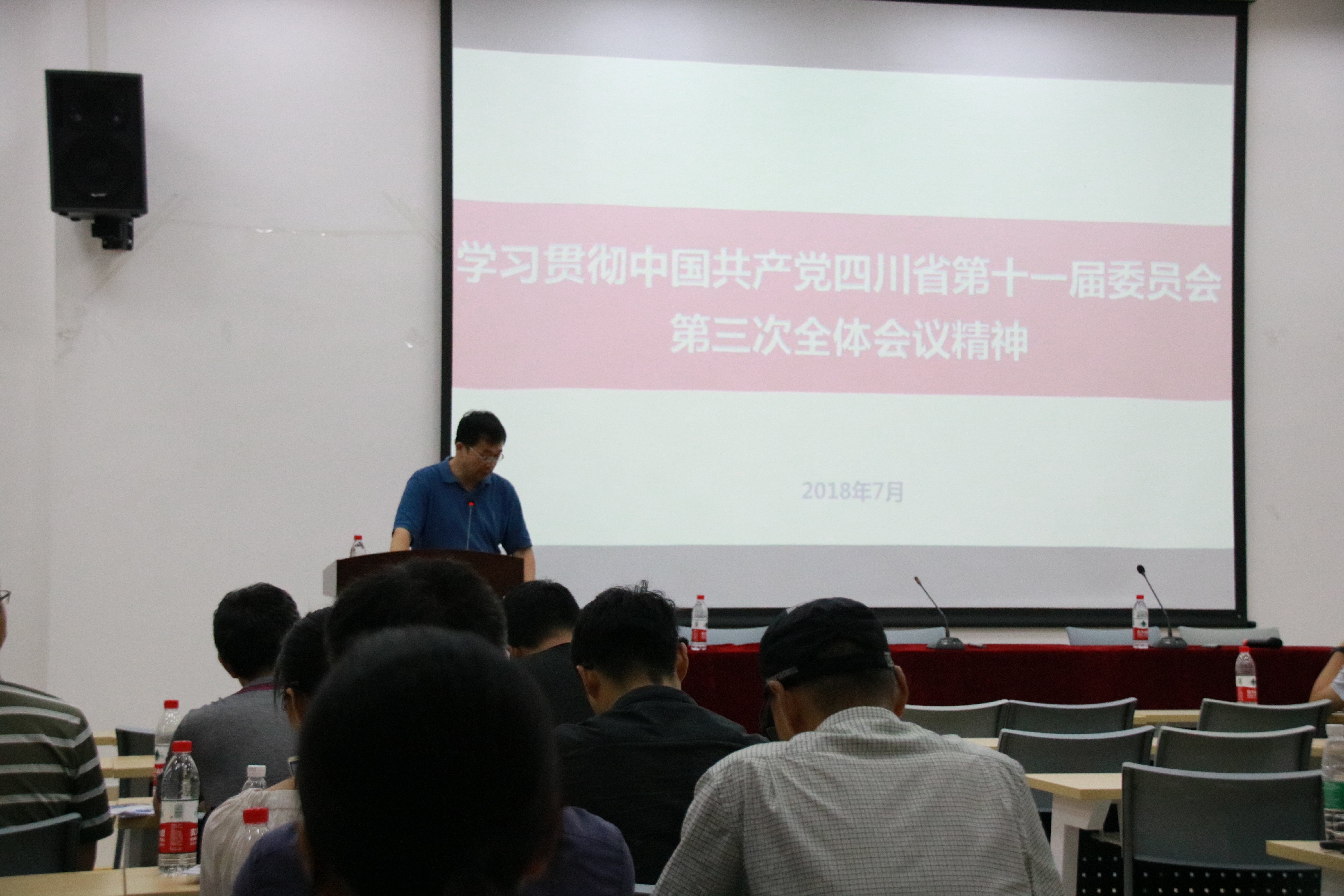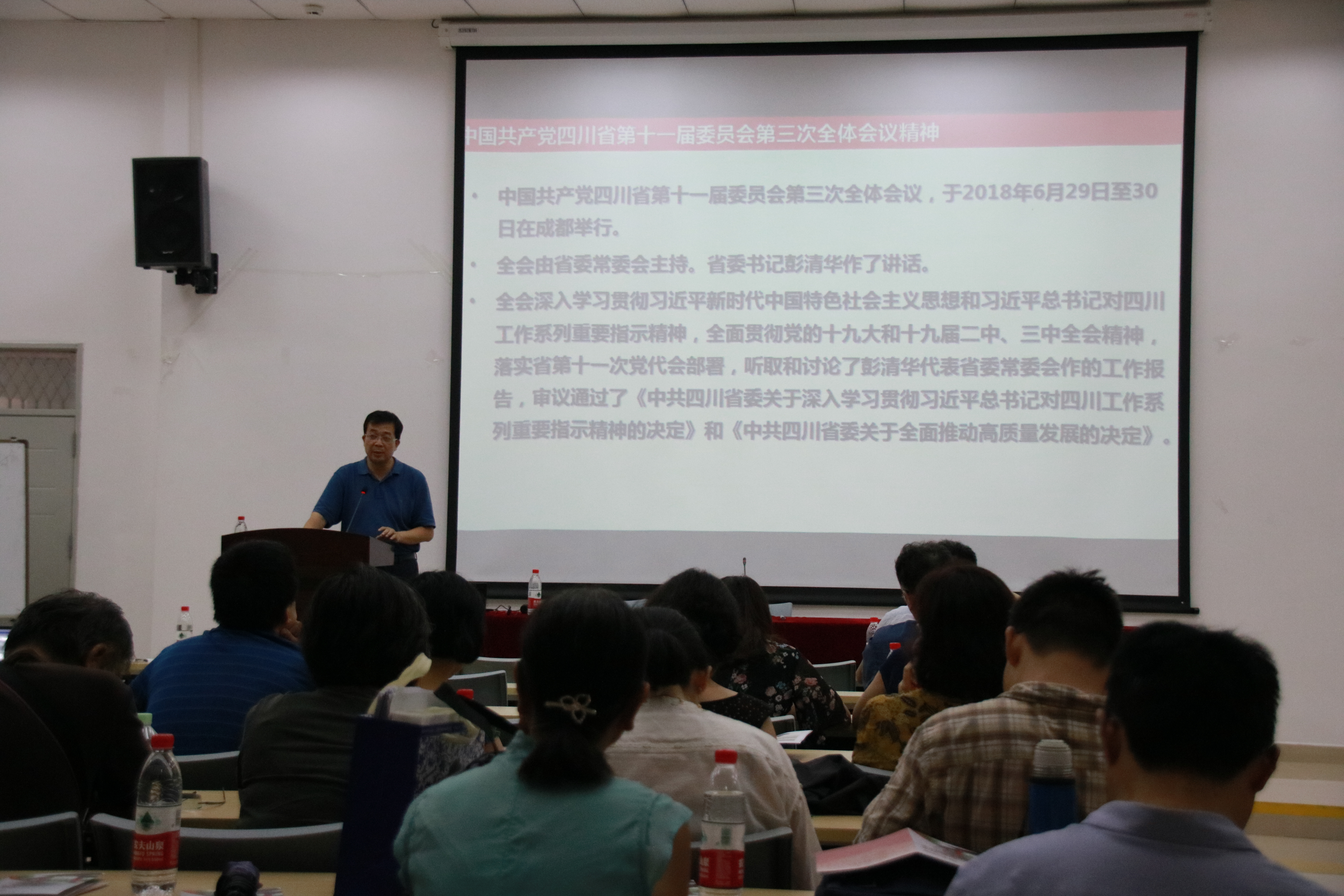 本次学习会由学院党委书记邰明松同志主讲,邰明松书记首先向全体教职工介绍了中国共产党四川省第十一届委员会第三次全体会议流程;之后,组织全体教职工共同学习了中国共产党四川省第十一届委员会第三次全体会议公报内容和精神,结合学院实际对全体教职工提出了具体的要求。