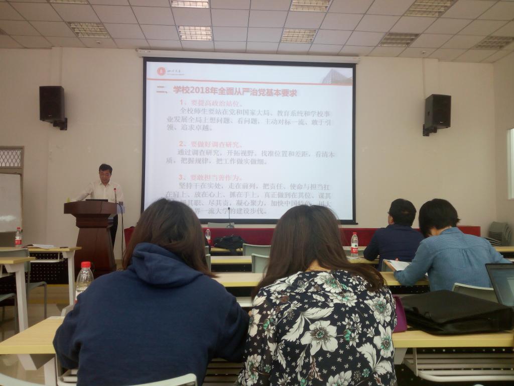 2018年从严治党工作会议精神四个方面为具体内容向在场教师作报告。邰书记强调了学校2018年全面从严治党的三个要求:第一,要提高政治站位;第二,要做好调查研究;第三,要敢担当善作为。向全院教职工全面阐述了学校全面从严治党的六大主要任务和四大措施,最后,邰书记强调全院教职工严于律己,廉洁自律,党员干部要在科研、教学上发挥模范带头作用,努力推动学院想、学校发展再上新台阶,并通过案例的形式向全体教职工讲述了违规违纪产生的严重后果,通过纪律警示教育的形式对全体教职工进行了纪律警示。
