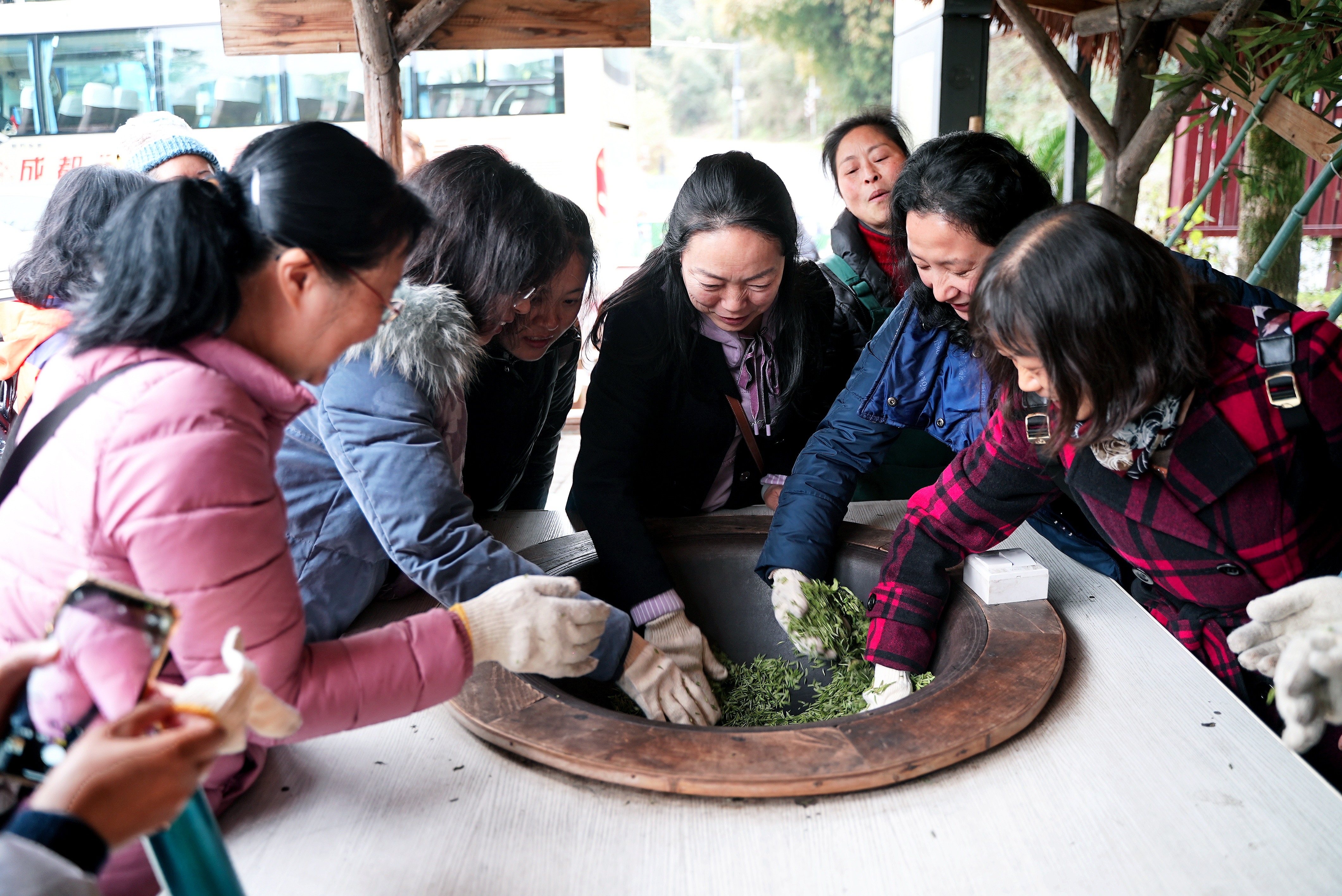 在欢快的气氛中大家开始第一个活动——采茶。大家背上竹蔸,系上头巾,迎着清新的微风,呼吸着新鲜的空气,在欢声笑语中涌入大自然的怀抱,愉快地采摘鲜嫩的茶叶。午饭稍事休息后,大家在茶溪谷讲师的带领下参观茶文化中心,初步认识了中国茶文化的博大精深,体验了现代茶叶的养生制品。随后,在茶溪谷专业制茶师傅的指导下,大家把上午采摘的茶叶放入制茶大铁锅里,先后带着手套亲自翻炒茶叶,亲自体验制茶工艺。每人都大家都表示要把自己采茶制作的茶叶好好珍惜,带给家人分享。最后茶溪谷的茶艺师为老师们讲解了盖碗茶礼仪及泡茶的正确方法,老师们亲自泡茶相互分享和敬茶。