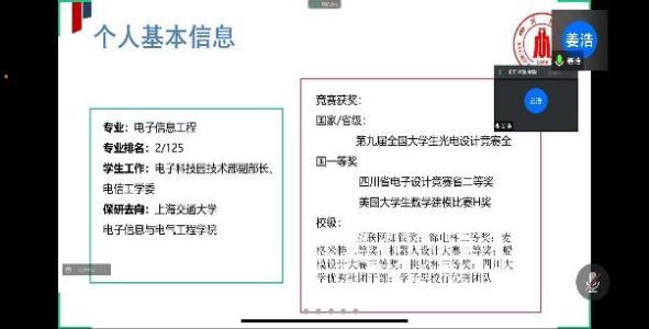 电子信息工程专业,保研至上海交通大学)分享如何在大学做好学业规划,兼顾学习与娱乐。他首先介绍学院各专业的培养方案组成情况和相关推免细则,接着从学习、竞赛、科研、社团等方面分别讲解了大一大二的学生可以做什么,应该做什么。在学习方面,姜浩同学提出不要唯分数论、不挂科是底线以及找准自己节奏的观点,并结合自身经历生动表达了学习的关键在于自身理解透彻;在竞赛与科研方面,他讲解了大学可以参加的一些关键性竞赛并分享在竞赛中一些问题的解决方案以及比赛后的感悟与收获。最后姜浩同学提醒了大家作为川大人要保持自信,认真对待每一个机会,对自己的选择负责。