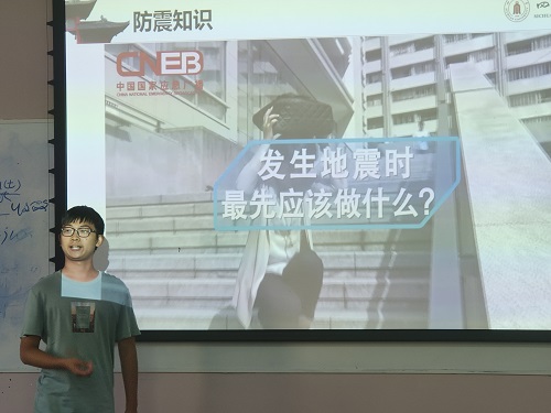 主讲人倪海智首先向大家介绍了洪涝灾害。洪涝灾害多发生于大雨、暴雨或持续性降雨之后,低洼地区就会出现淹没及渍水现象。当前已步入夏季,成都雨季已经来临。为了让同学们直观地理解在遇到洪涝灾害时自救避险的正确做法,主讲人播放了中国应急广播的视频进行辅助说明。随后,主持人介绍了地震灾害。四川省位于中国南北地震带的终端,地震发生频率较高。当地震发生时,人们大都处于慌张之中难以正确应对。主讲人提醒同学们要在日常生活中提高安全意识,将遇到突发情况时候的逃生注意事项牢记在心。此外,事先做好准备,准备好应急物品,也是极其重要的一环。最后,主讲人介绍了气象灾害。夏季极端天气出现频率较高,尤其是雷暴,大风,冰雹等情况常常出现,恶劣环境下降低伤害的最好方法就是以最快的速度寻找到躲避的场所。主讲人提醒大家平时可以多参加社区或学校组织的应急避险培训或演练,熟悉到达应急避难场所的疏散路线和应急避难场所的设备使用方法,提高自救互救意识和技能。