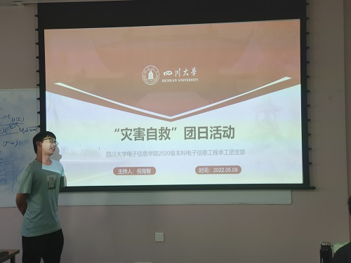 本科2020级各班团支部陆续开展以灾害自救为主题的团日活动。2022年5月9日下午4时,学院本科2020级9班团支部在江安校区一教A401开展活动,对防灾减灾知识及基本应急避险技能进行了详细介绍。