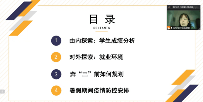 本次家长会的主要内容为“由内探索:学生成绩分析”、“对外探索:就业环境”、“奔‘三’前如何规划”、“暑假期间疫情防控安排”四个部分。