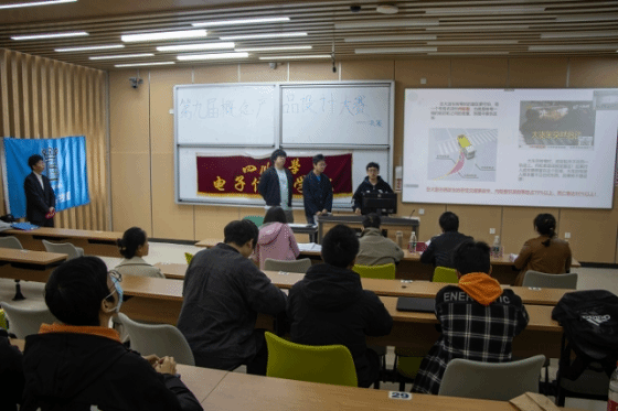 概念产品设计大赛决赛在综合楼C座105教室举行,比赛的形式是交纸质版作品报告,并进行PPT现场展示。出席现场的老师有华伟老师、李玮老师、孟庆党老师、朱婧老师、孟滋常老师、陈林老师,其中孟庆党和李玮两位老师在线上参与评审,还有入围a漫