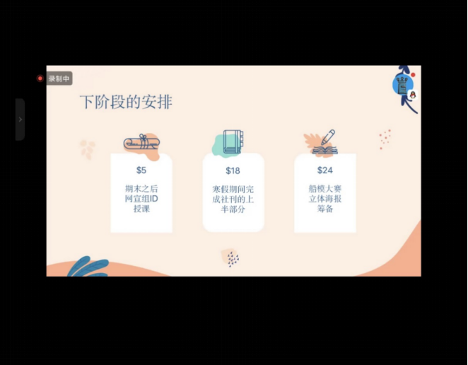 首先,由主席团成员对本学期主席团的工作进行了总结。紧接着,分别由技术部肖迪同学,行政部施金住同学,宣传部孔令杰同学及外联部沈琳鸿同学总结汇报本学期各部门的工作情况并对下学期的部门工作做了初步的安排。最后,对下学期即将举办的船模大赛的内部宣传极大地调动了同学们的参赛积极性。
