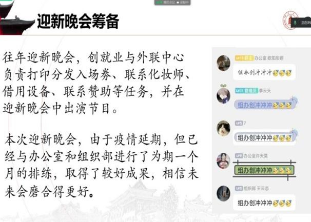 团委学生会举办的团学第二次大例会在线上举行。团委副书记朱婧老师、团委学生会主席团、部长团以及全体22级团学干事全员参与了此次例会。