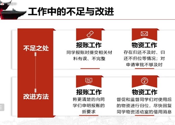 接下来,组织部、办公室、宣传部、创就业与外联中心、体育部、文艺部、权益素拓部、学科部与“腾飞”青年志愿者服务队的代表们分别进行了各部门2022年至2023年秋季学期相关工作的总结,其中包括学期部门工作汇报、部门及成员收获、部门工作不足之处和下学期的工作计划与展望四个部分。
