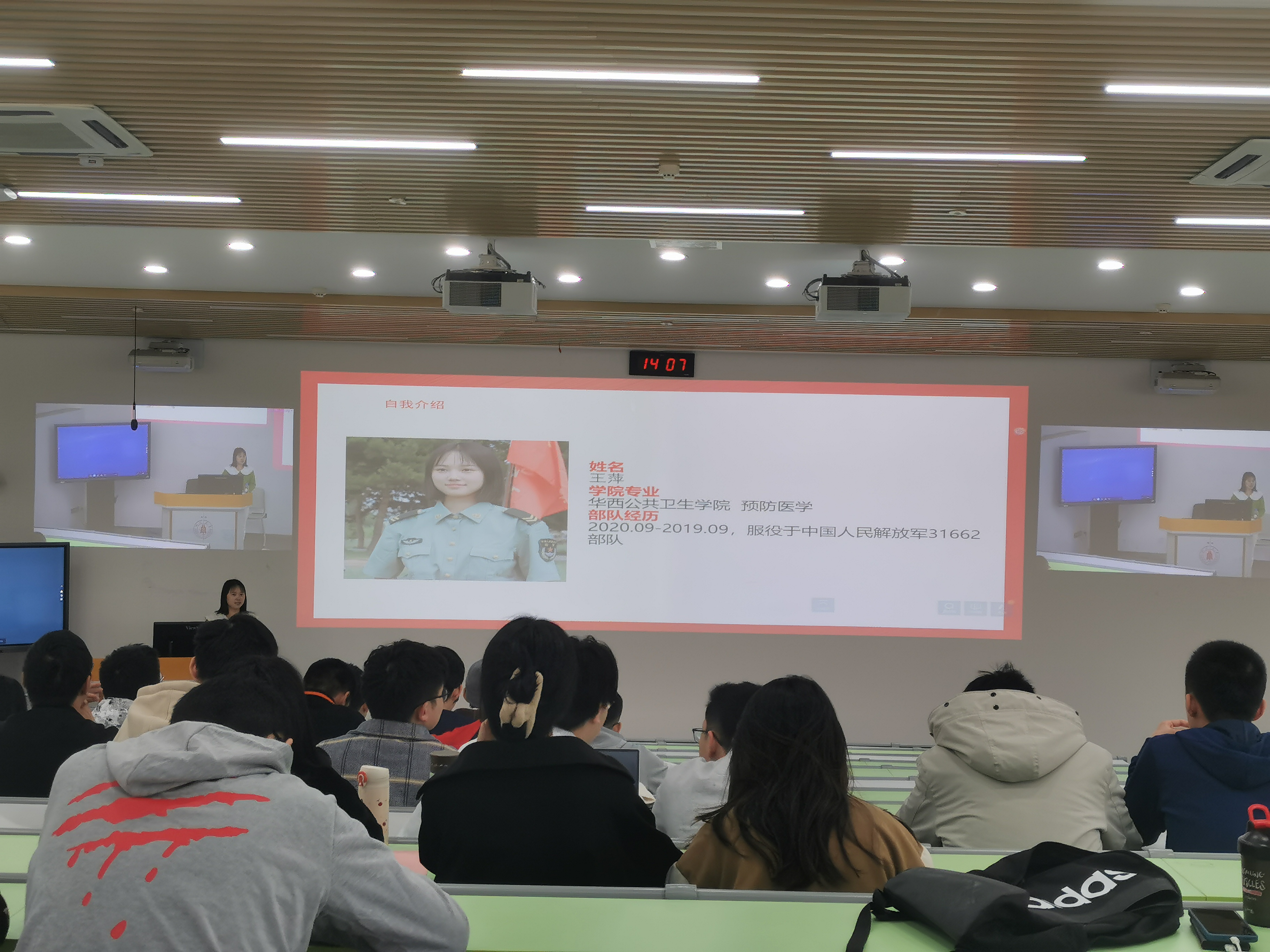 2023年3月24日基础教学楼C201,谢老师组织开展了丰富的形教课程。整个课堂分成了两个部分。第一部分是由王萍学姐进行的征兵宣讲。王萍学姐通过短视频的方式,以幽默俏皮的风格讲述了自己温馨欢乐又别致的军队生活。王萍学姐分享到“强军之道在于强人”军队越来越注重高素质人才的培养,希望更多大学生参军入伍,通过参军入伍,同学们也能够收获别样的人生体验。