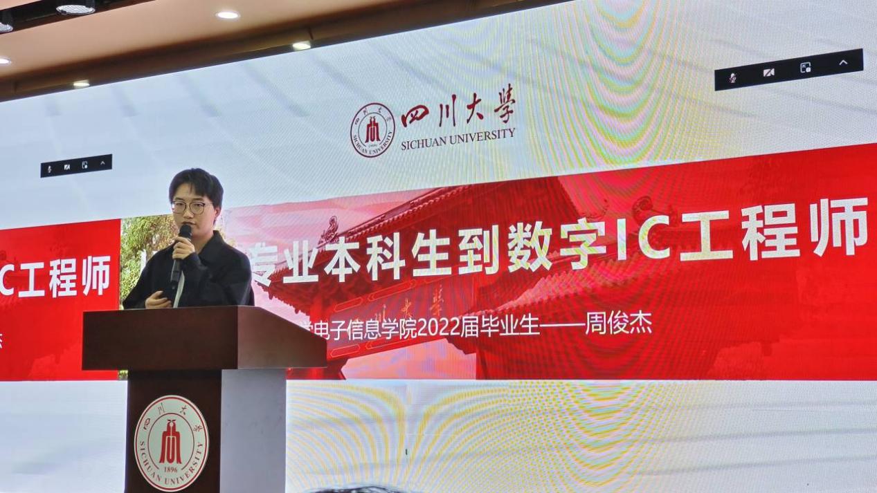 毕业后就职于沐曦科技(成都)有限公司担任数字IC工程师,周俊杰学长在电子专业就业方向着重介绍了数字IC工程师。数字IC及Integrated Circuit方面的知识和应用,详细讲解了数字IC方向的当下风口和开发流程,为同学们对未来的规划提供了思路。最后周俊杰学长就同学关心的问题进行详细解答和充分交流。