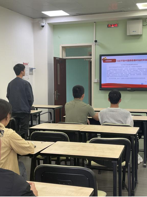 最后,赵俊东同学为我们读了“习近平致中国南极秦岭站的贺信”,中共中央总书记、国家主席、中央军委主席习近平致信表示热烈祝贺,“从无到有、由弱到强”“取得了丰硕成果”,深刻体会习近平总书记在贺信里对40年来我国极地事业的高度肯定,向广大极地工作者致以诚挚问候和美好的新春祝福,指出秦岭站建成的重要意义,对下一步工作作出了重要指示。习近平总书记的贺信为新时代新征程极地工作指明了前进方向、提供了根本遵循,为进一步系统谋划、整体推进极地工作、构建极地事业发展新格局提供了强大思想武器和科学行动指南,站位高远、立意宏大,亲切关怀、殷切希望,话语温暖、催人奋进。