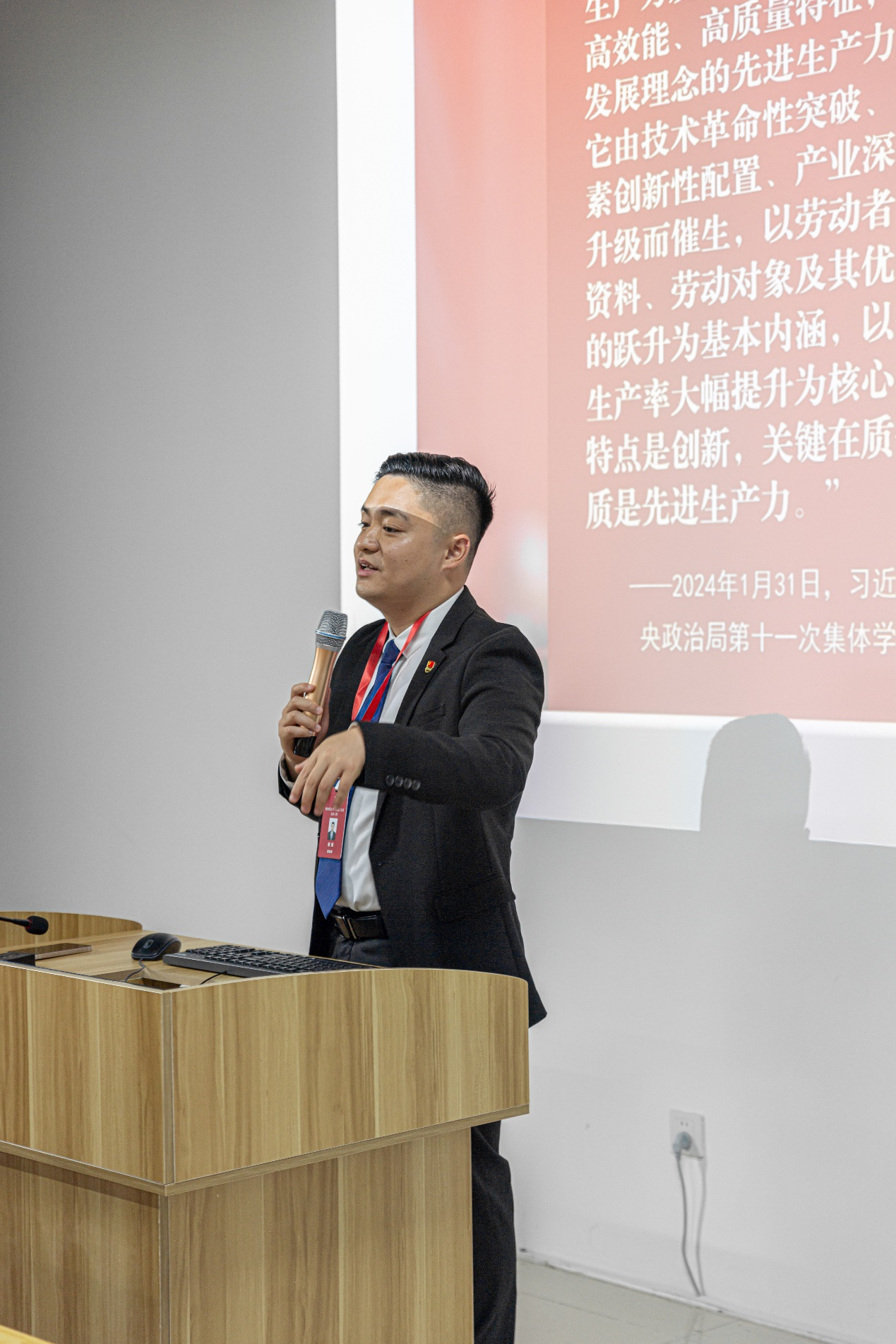 “青年讲师团”成员谢熠开展主题教育分享,结合自身的学习经历和实践经验,深入浅出地阐述了马克思主义对生产力和生产关系的理论。