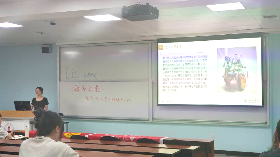 ,并就电子信息工程、通信工程、光电信息科学与工程三个分流专业讲述了其专业联系与差别以及各方向的就业前景。讲解结束后,谭晶晶同学组织在座同学讨论了自己对电子信息专业的看法以及其他专业在电子信息专业内的应用。胡源小卷同学就电子信息专业在生活中的应用发表了深刻见解。