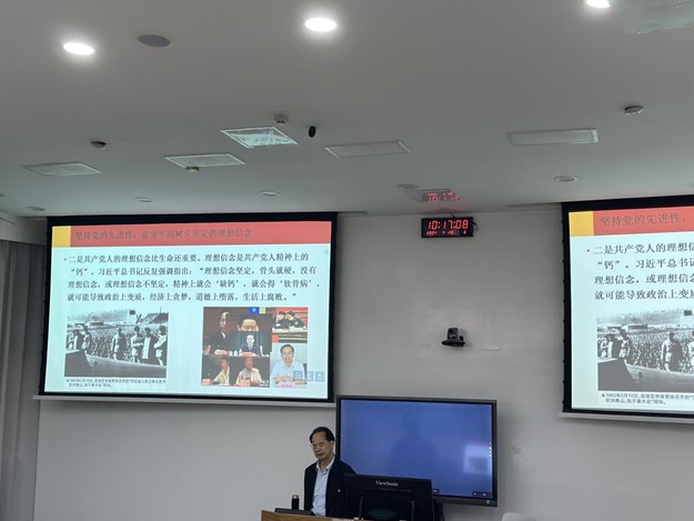 典礼结束后,校关工委办公室主任汪朝清老师为学员们开启了首场培训课程——“党的性质”。汪老师详述了党的性质的法理性定义来源与发展历程,阐释了党的性质指向的党的阶级性与先进性,同时,他还以党的性质为线索,向学员们引入党形成的新时代发展指导思想。他教导学员们新时代如何坚持党的性质,如何为党的事业而奋斗,并鼓励广大青年将理论与实践结合起来,积极向党组织靠拢。