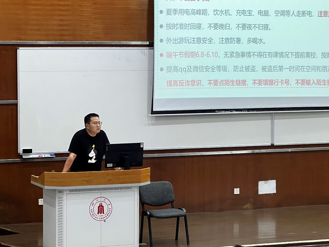 本科2023级学生于综合楼C407召开5月份年级大会。年级大会由辅导员申鑫主持,涵盖了安全教育、电信诈骗防范、期中成绩分析、思想教育活动以及其他重要事项的讨论。