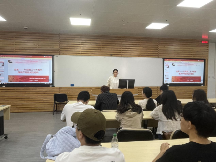 20级党支部第二支部在基础教学楼A座A308开展了党课学习主题活动。由学院的计玉娟书记作为主讲人,围绕着变革,向党员们讲述了题为“变革——从党的二十大看中国共产党的成功密码”的一堂富有深远意义的党课。
