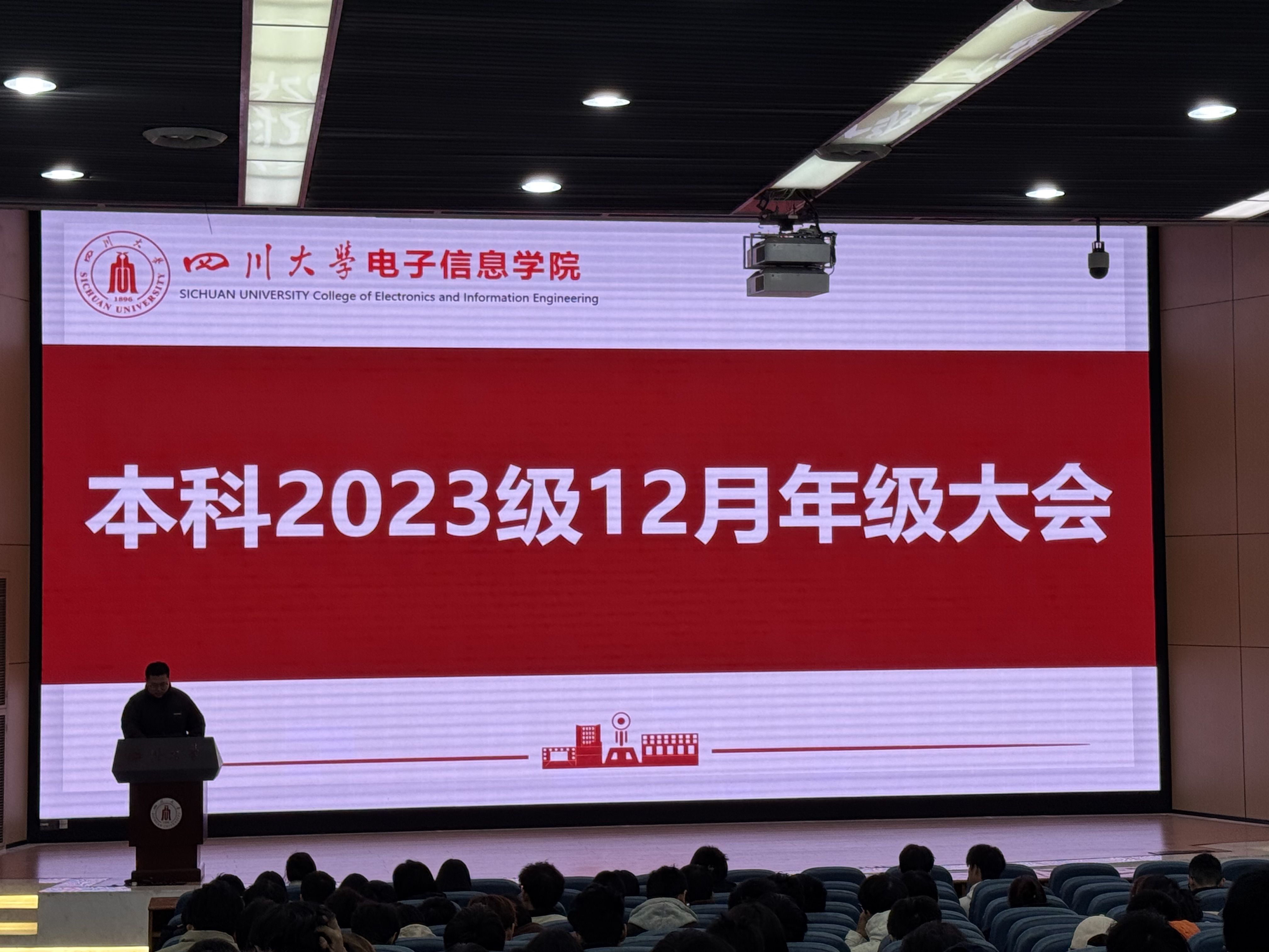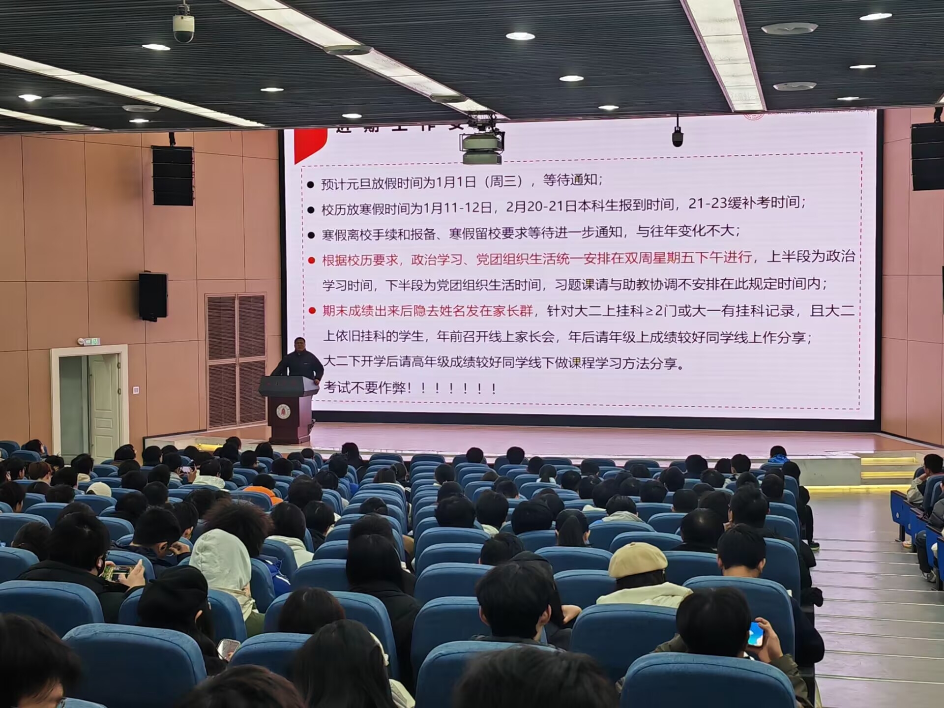 12月年级大会于在江安校区水上报告厅成功举行。本次大会由辅导员老师申鑫主持,向学生们详细传达了近期的工作安排和重要通知。