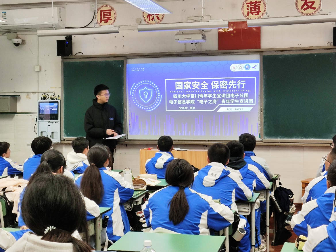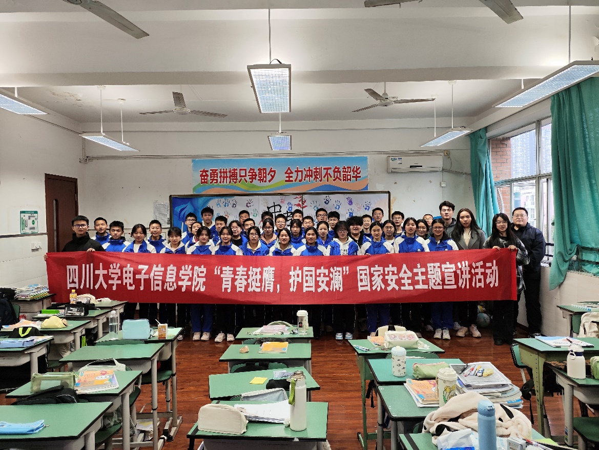 “电子之鹰”青年宣讲团开展国家安全知识科普主题宣讲活动。首站走进成都华西中学初中部,院团委副书记、宣讲团指导教师申鑫,兼职辅导员杨婉丁,宣讲团成员吴浩、易音彤、谭晶晶、马亦岑参加宣讲活动。