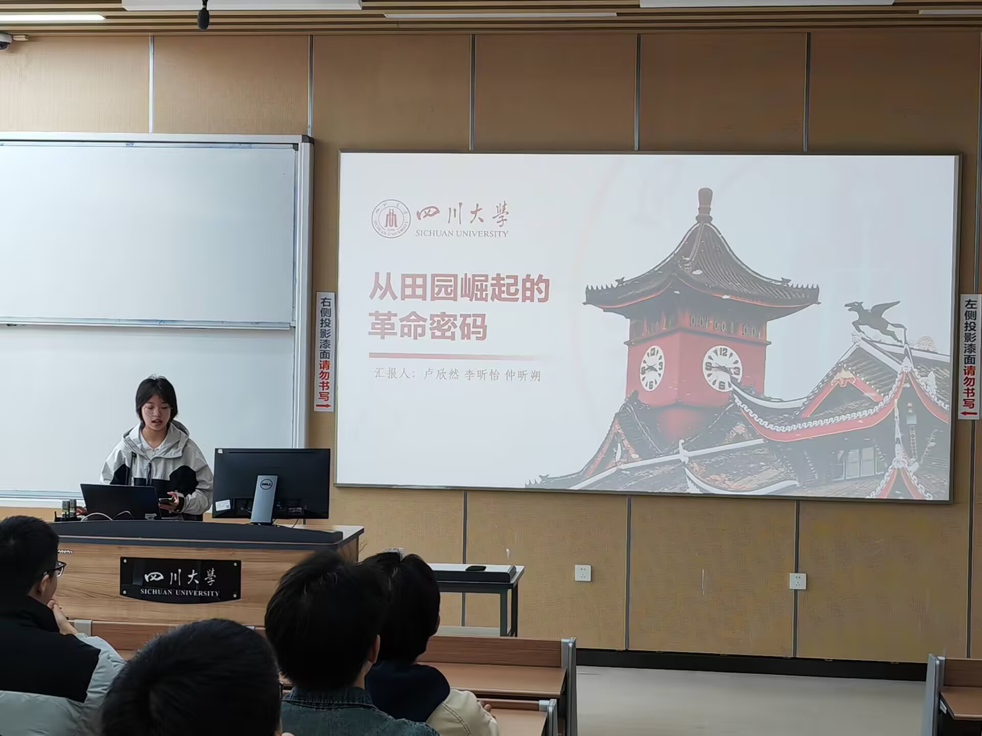 活动开始,仲欣朔小组进行了有关农民运动的分享,小组成员卢欣然、李昕怡和仲昕朔分别讲述了农民运动的理论探索,实践历程和历史影响,以土地改革为线索,生动地展现了中国共产党创建时期农民运动的发动和推进过程,展现了农民运动对中国革命的进程的推动作用。