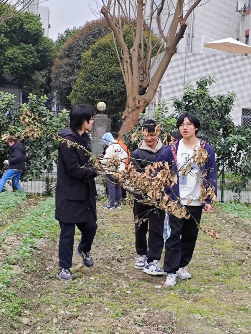 活动现场,劳动教育指导老师为同学们分发了劳保手套,并划定清洁区域。同学们迅速投入劳动:田间散落着周边树木掉落的枯枝,大家自发两三人一组协作搬运,将长短不一的树枝集中清运至指定堆放点;另有小组负责清扫碎石、归整田垄工具。虽然春阳微灼,但同学们热情高涨,弯腰俯身间汗水浸透衣衫。