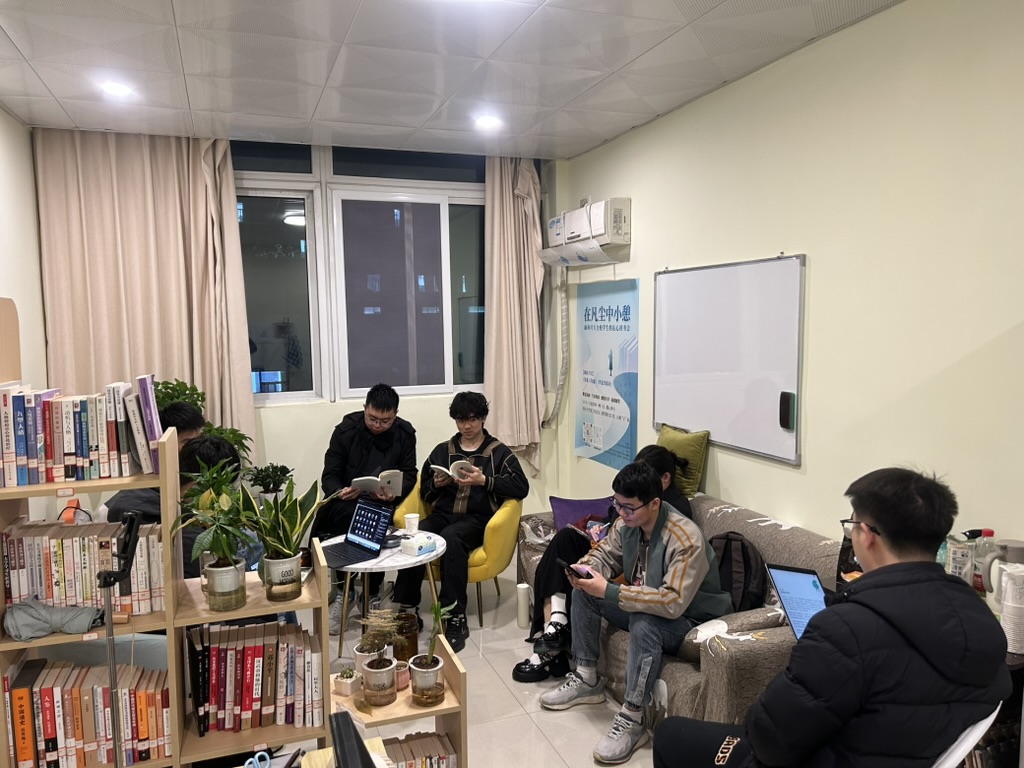 望江校区东三教学楼525室举办的读书会中,何惠老师线上参与指导,辅导站学生站长李岩峰同学担任领读,活动采取线上线下相结合的方式进行。